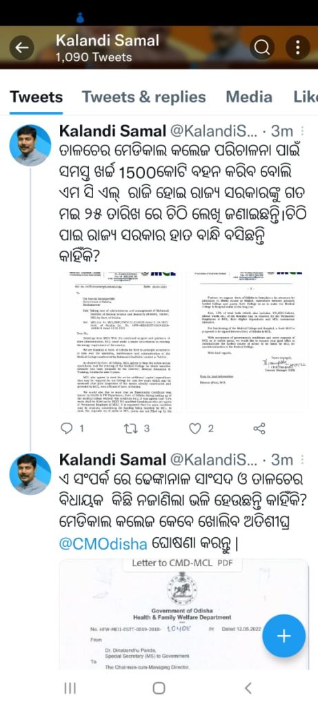 ପୂର୍ବ ନିଷ୍ପତ୍ତି ଅନୁଯାୟୀ ଏମସିଏଲ ଓ ରାଜ୍ୟ ସରକାର ଙ୍କ ମଧ୍ୟରେ ହୋଇଥିବା ବୁଝାମଣା ଅନୁସାରେ ମେଡିକାଲ କଲେଜ ରାଜ୍ୟ ସରକାର ଚଳାଇବେ ଏବଂ ମେଡିକାଲ କଲେଜ କୁ ଏମସିଏଲ ସମ୍ପୂର୍ଣ ଭାବେ ନିର୍ମାଣ କରିବେ, କିନ୍ତୁ ରାଜ୍ୟ ସରକାର ମେଡିକାଲ କଲେଜ ଚଳାଇବା ପାଇଁ ପୂର୍ଵ ନିଷ୍ପତ୍ତି ରୁ ଅପସରି ଯାଇ ମେଡିକାଲ କଲେଜ ଚଳାଇବା ପାଇଁ ନା ଗନ୍ଧ ନେଲା ନାହିଁ, ଏବଂ ପ୍ରାଇଭେଟ ହାଇଟେକ ସଂସ୍ଥା କୁ ଏହି ମେଡିକାଲ କଲେଜ ଦେବା ପାଇଁ ମସୁଧା ଚଲାଇ ଥିଲା |ତାଳଚେର ରେ ବ୍ୟାପକ ଭାବେ ଜନ ଆନ୍ଦୋଳନ ଦେଖାଦେଲା |କେନ୍ଦ୍ରମନ୍ତ୍ରୀ ଧର୍ମେନ୍ଦ୍ର ପ୍ରଧାନ ଙ୍କ ତାଳଚେର ଗ୍ରସ୍ତ ବେଳେ ତାଳଚେର ର ବୁଦ୍ଧିଜୀବୀ ଏବଂ ବିଭିନ୍ନ ସଂଗଠନ ଭେଟି ମେଡିକାଲ କଲେଜ ଚାଲୁ କରିବା ପାଇଁ ଅନୁରୋଧ କରିଥିଲେ |କେନ୍ଦ୍ରମନ୍ତ୍ରୀ ଶ୍ରୀ ପ୍ରଧାନ ମେଡିକାଲ କଲେଜ ଚଲାଇବା ପାଇଁ , କେନ୍ଦ୍ର କୋଇଲା ମନ୍ତୀ ଙ୍କ ଦୃଷ୍ଟି ଆକର୍ଷଣ କରିଥିଲେ | କେନ୍ଦ୍ରମନ୍ତ୍ରୀ ଙ୍କ ହସ୍ତକ୍ଷେପ ଫଳରେ ସମୁର୍ଣ୍ଣ ଖର୍ଚ୍ଚ ଏମସିଏଲ ବହନ କରିବ ବୋଲି ଲିଖିତ ଭାବେ 21ଏପ୍ରିଲ ରେ ଜଣାଇଥିଲା |ପୁନଶ୍ଚ ରାଜ୍ୟ ସରକାର ମେ 12ରେ ଅନ୍ୟ ଏକ ପତ୍ର ମାଧ୍ୟମରେ ଏମସିଏଲ ଠାରୁ ସ୍ପଷ୍ଟୀକରଣ ମାଗିଥିଲେ | ତାଳଚେର ମେଡିକାଲ କଲେଜ ପରିଚାଳନା ପାଇଁ ସମସ୍ତ ଖର୍ଚ୍ଚ 1500କୋଟି ବହନ କରିବ ବୋଲି ଏମ ସି ଏଲ୍ ରାଜି ହୋଇ ରାଜ୍ୟ ସରକାରଙ୍କୁ ଗତ ମଇ ୨୫ ତାରିଖ ରେ ଚିଠି ଲେଖି ଜଣାଇଛନ୍ତି।ଚିଠି ପାଇ ରାଜ୍ୟ ସରକାର ହାତ ବାନ୍ଧି ବସିଛନ୍ତି କାହିଁକି?ଏ ସଂପର୍କ ରେ ଢେଙ୍କାନାଳ ସାଂସଦ ଓ ତାଳଚେର ବିଧାୟକ କିଛି ନଜାଣିଲା ଭଳି ହେଉଛନ୍ତି କାହିଁକି?ମେଡିକାଲ କଲେଜ କେବେ ଖୋଲିବ ଅତିଶୀଘ୍ର ମୁଖ୍ୟମନ୍ତ୍ରୀ ଘୋଷଣା କରନ୍ତୁ ବୋଲି ରାଜ୍ୟ ସମ୍ପାଦକ କାଳନ୍ଦୀ ସାମଲ ଟ୍ୱିଟ ଯୋଗେ ପ୍ରଶ୍ନ କରିଛନ୍ତି|