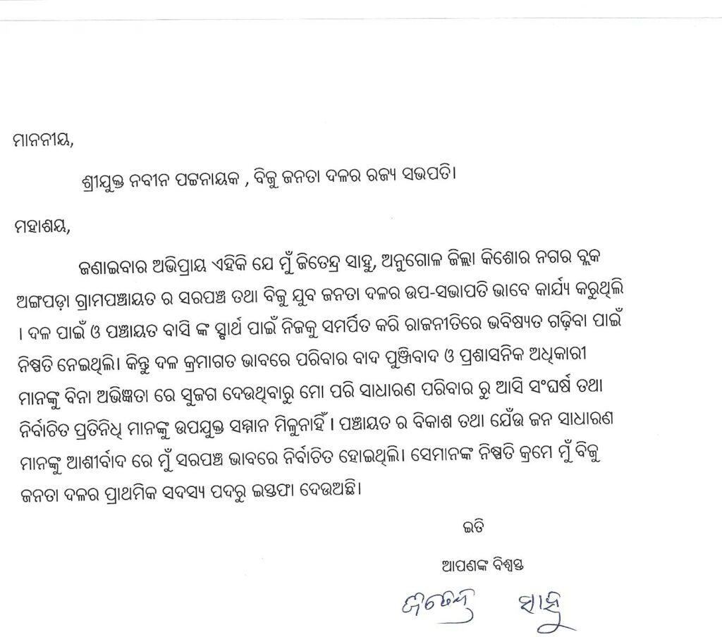 ଅନୁଗୋଳ: ବିଜେଡ଼ି ଛାଡ଼ିଲେ ଆଠମଲ୍ଲିକ ବ୍ଲକ ଅଙ୍ଗପଡ଼ା ସରପଞ୍ଚ ତଥା ଜିଲା ଯୁବ ବିଜେଡ଼ି ଉପସଭପତି ଜିତେନ୍ଦ୍ର ସାହୁ ବିଜେଡିରୁ ଦେଲେ ଇସ୍ତଫା। ଦିନକୁ ଦିନ ବିଜେଡି ପରିବାର ବାଦ, ପୁଞ୍ଜିବାଦ ଓ ଅନଭିଜ୍ଞ ଙ୍କ ହାତ କୁ ଯାଉଥିବାରୁ ଜିତେନ୍ଦ୍ର ଇସ୍ତଫା ଦେଇଥିବା ନେଇ ବିଜେଡି ରାଜ୍ୟ ସଭାପତି ଙ୍କୁ ମେଲ ଯୋଗେ କଲେ ଅବଗତ।