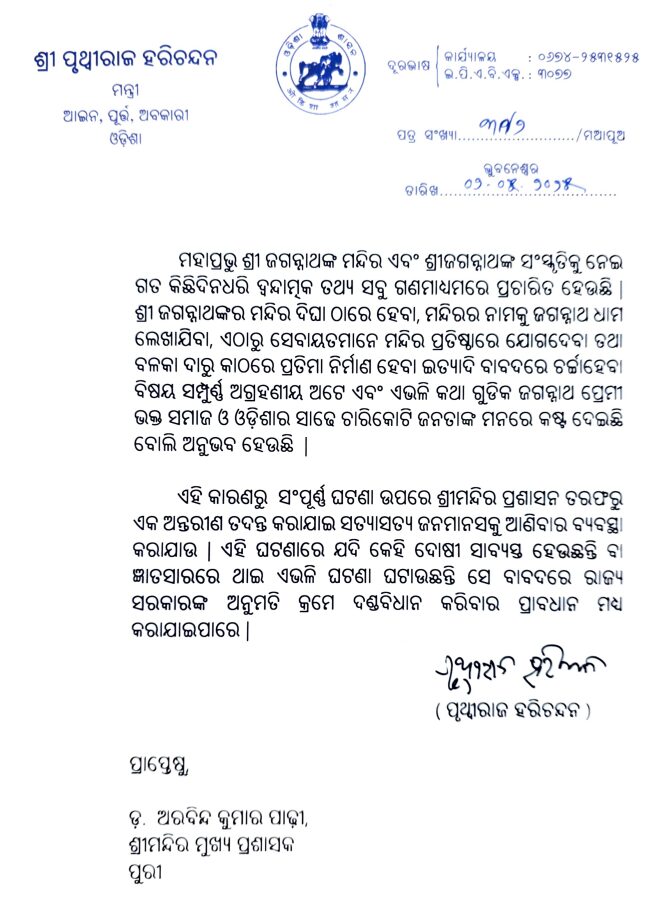 ଏହି କାରଣରୁ ସଂପୂର୍ଣ ଘଟଣା ଘଟଣା ଉପରେ ଶ୍ରୀମନ୍ଦିର ପ୍ରଶାସନ ତରଫରୁ ଏକ ଅନ୍ତରୀଣ ତଦନ୍ତ କରାଯାଇ ସତ୍ୟାସ ସତ୍ୟ ଜନମାନସକୁ ଆଣିବାର ବ୍ୟବସ୍ଥା କରାଯାଉ | ଏହି ଘଟଣାରେ ଯଦି କେହି ଦୋଷୀ ସାବ୍ୟସ୍ତ ହେଉଛନ୍ତି ବା ଜ୍ଞାତସାରରେ ଥାଇ ଏ ଏଭଳି ଘଟଣା ଣା ଘଟାଉଛନ୍ତି ସେ ବାବଦରେ ରାଜ୍ୟ ସରକାରଙ୍କ ଅନୁମତି କ୍ରମେ ଦଣ୍ଡବିଧାନ କରିବାର ପ୍ରାବଧାନ ମଧ୍ୟ କରାଯାଇପାରେ |